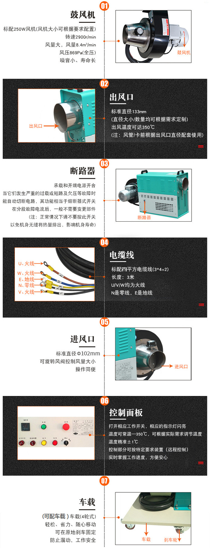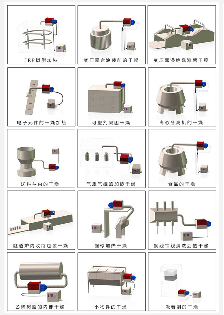 廣泛應(yīng)用于包裝機(jī)械、食品加工、醫(yī)療機(jī)械、印刷、汽車(chē)、材料熱處理、橡膠制品等行業(yè)的干燥升溫。